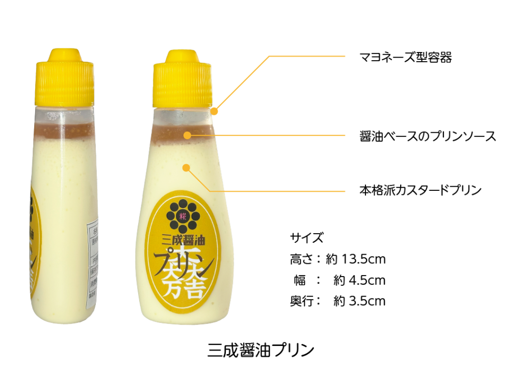 写真のように容器はマヨネーズ型をしています。これは元々彦根観光に来られた方が歩きながら召し上がっていただけるよう、また食べる前に醤油ソースとプリンを混ぜ合わせて召し上がっていただくため、撹拌しやすい容器として考え出されました。